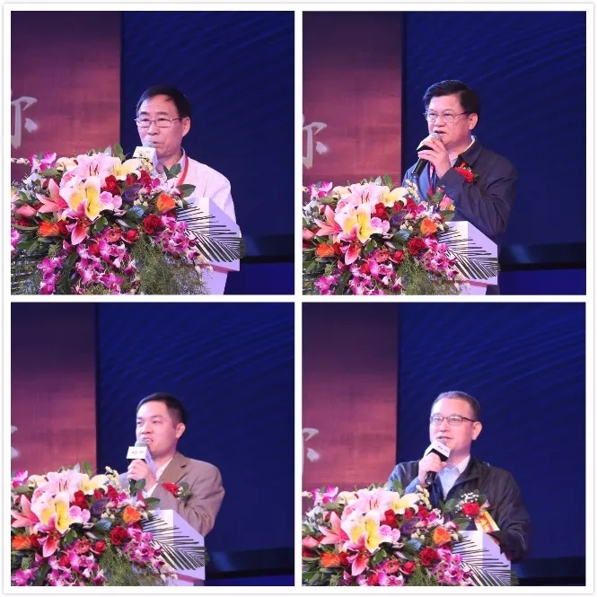 中国农技推广协会秘书长张互助(左上)、广东省耕地总站站长肖植雄(右上)、中国植物营养与肥料学会副秘书长王磊(左下)和南方农村报总编辑陈永(右下)为庆典致祝福辞
