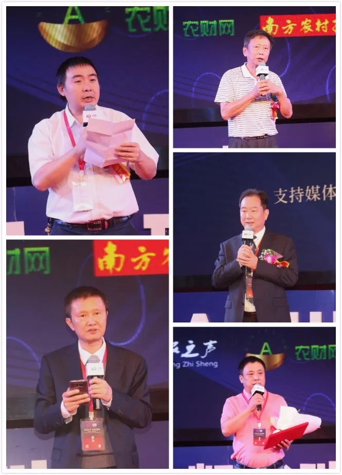 创新媒体合作奖代表南方农村报副总经理王贤原(左上)、杰出贡献奖代表华南农业大学教授廖宗文(右上)、土壤修护研究院特聘专家团队代表华中农业大学教授吴礼树(右中)、十年合作经销商代表兼企业战略发展顾问百步农资董事长林伟坚(左下)、十年新锐经销商兼企业战略发展顾问代表王庭阁(右下)